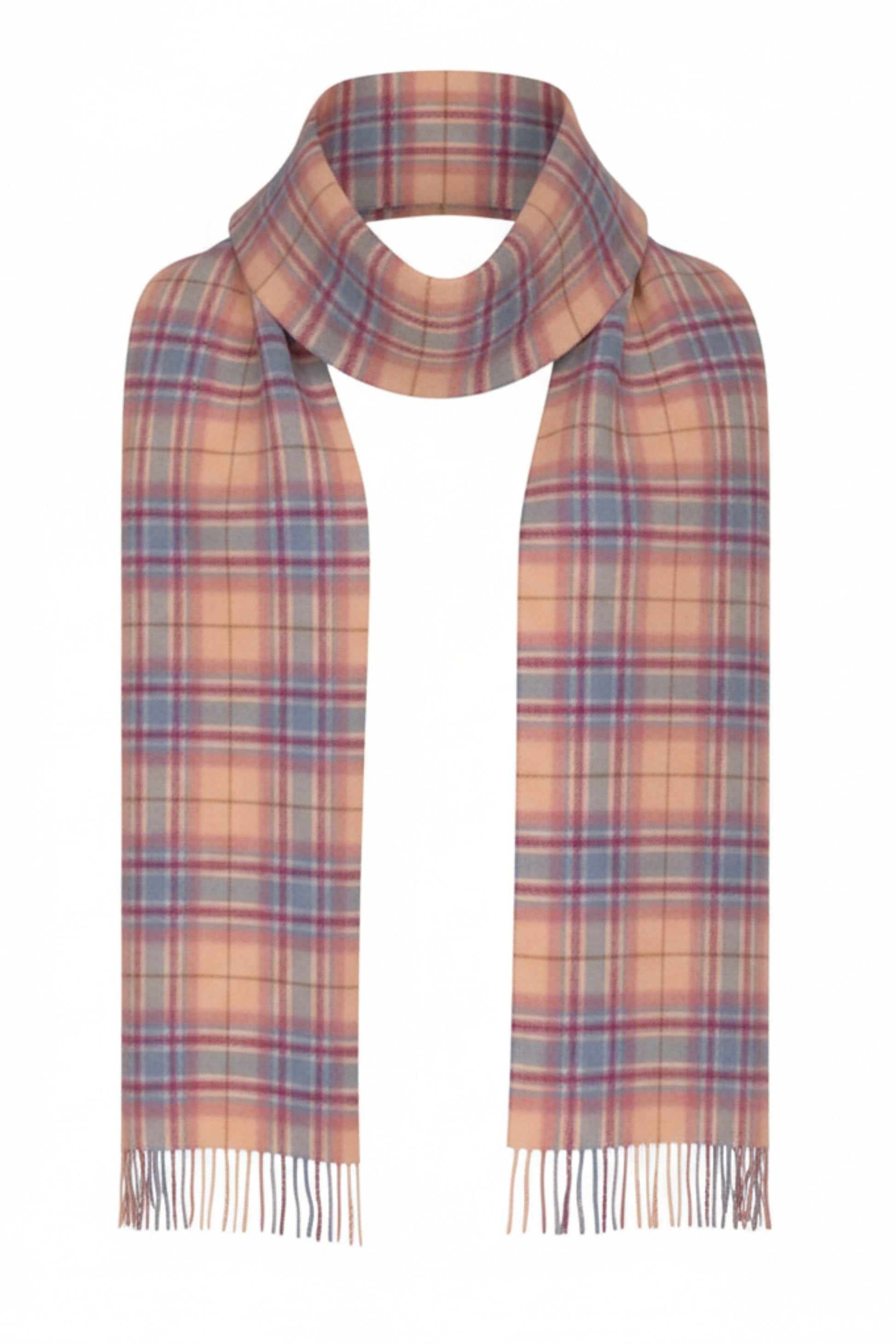 Indulge in timeless elegance with this exquisite cashmere scarf, crafted from 100% pure cashmere for unparalleled softness and warmth. The refined frothy pink, blue and buff check pattern brings understated sophistication to any ensemble, whether draped casually or styled with intention. A luxury investment piece that transcends seasons, this scarf promises lasting comfort and enduring style for the discerning wearer.